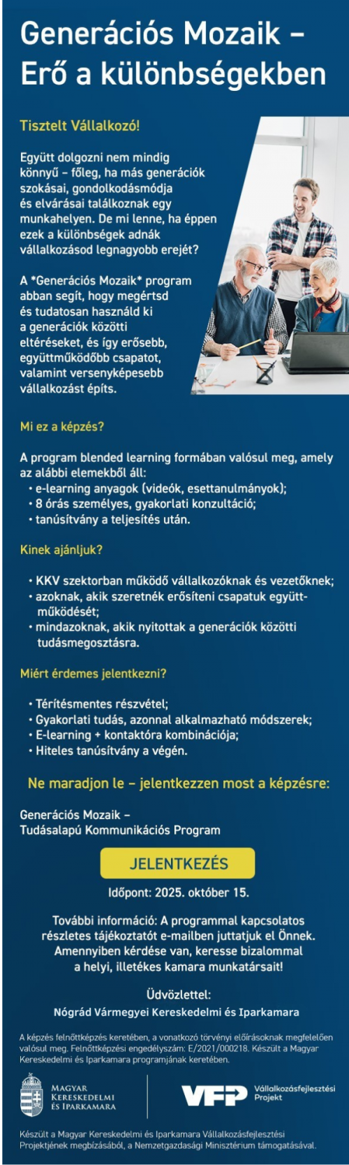 A generációk közötti együttműködés kulcs a sikeres csapatmunkához és a versenyképes vállalkozáshoz. A Generációs Mozaik program segít abban, hogy megértsük a különböző korosztályok gondolkodásmódját, és tudatosan építsünk hatékonyabb, összetartóbb munkahelyi közösséget.
